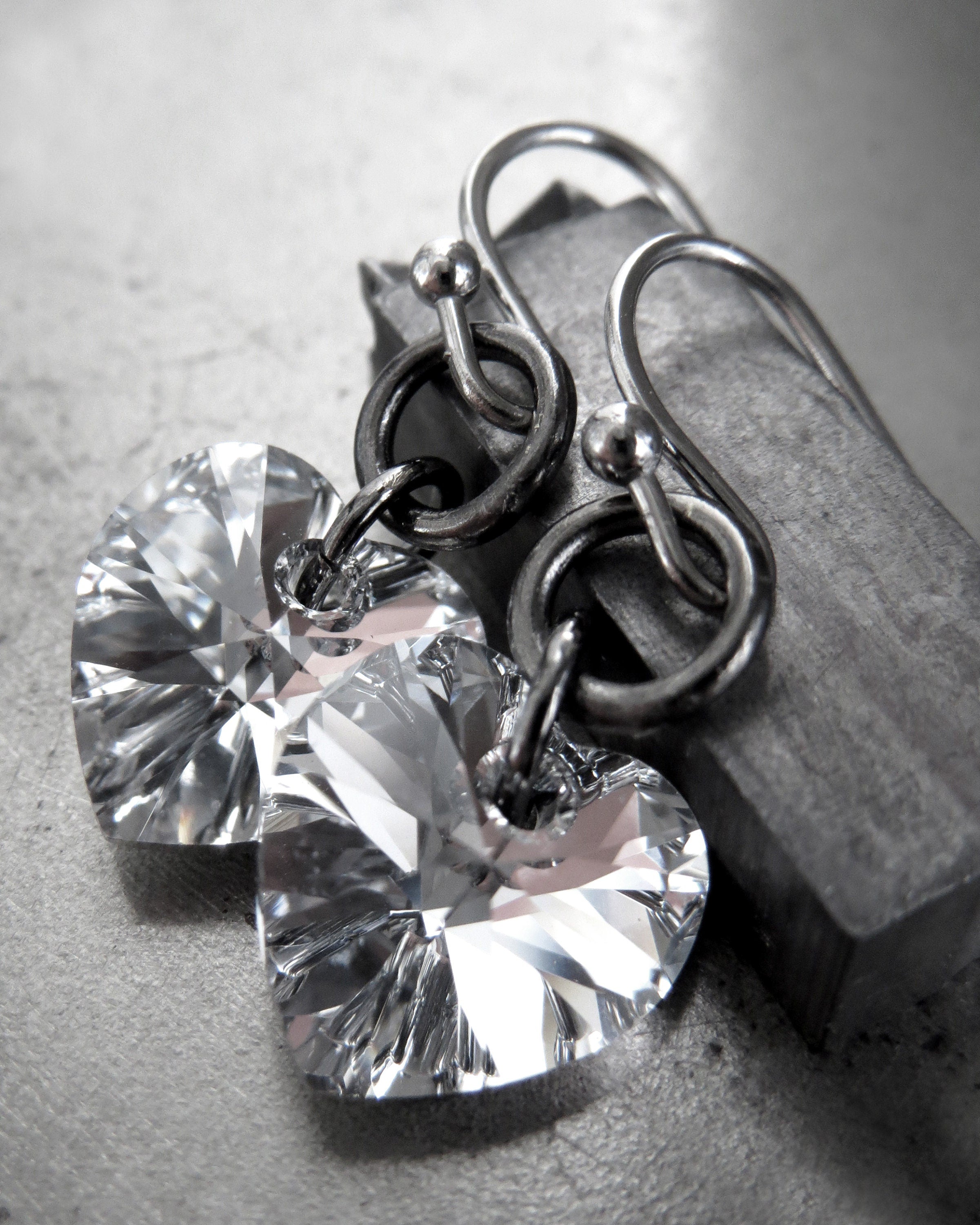 These stunning petite crystal hearts are paired up with black gunmetal-plated findings for a not-too-sweet style. Simply beautiful + affordable gift of love for Valentine's Day, date or anniversary.